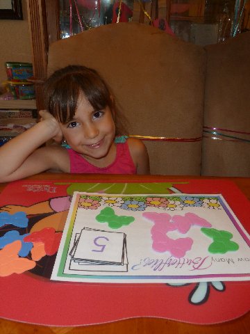 I had her work on a white board and we wrote out the problems together. I wrote __ +__ = for her and she would fill in the numbers based on cards she would flip over from her pile (I only had her use numbers 0-5 this time) and then she would count the butterfly to add them up and write the answer.